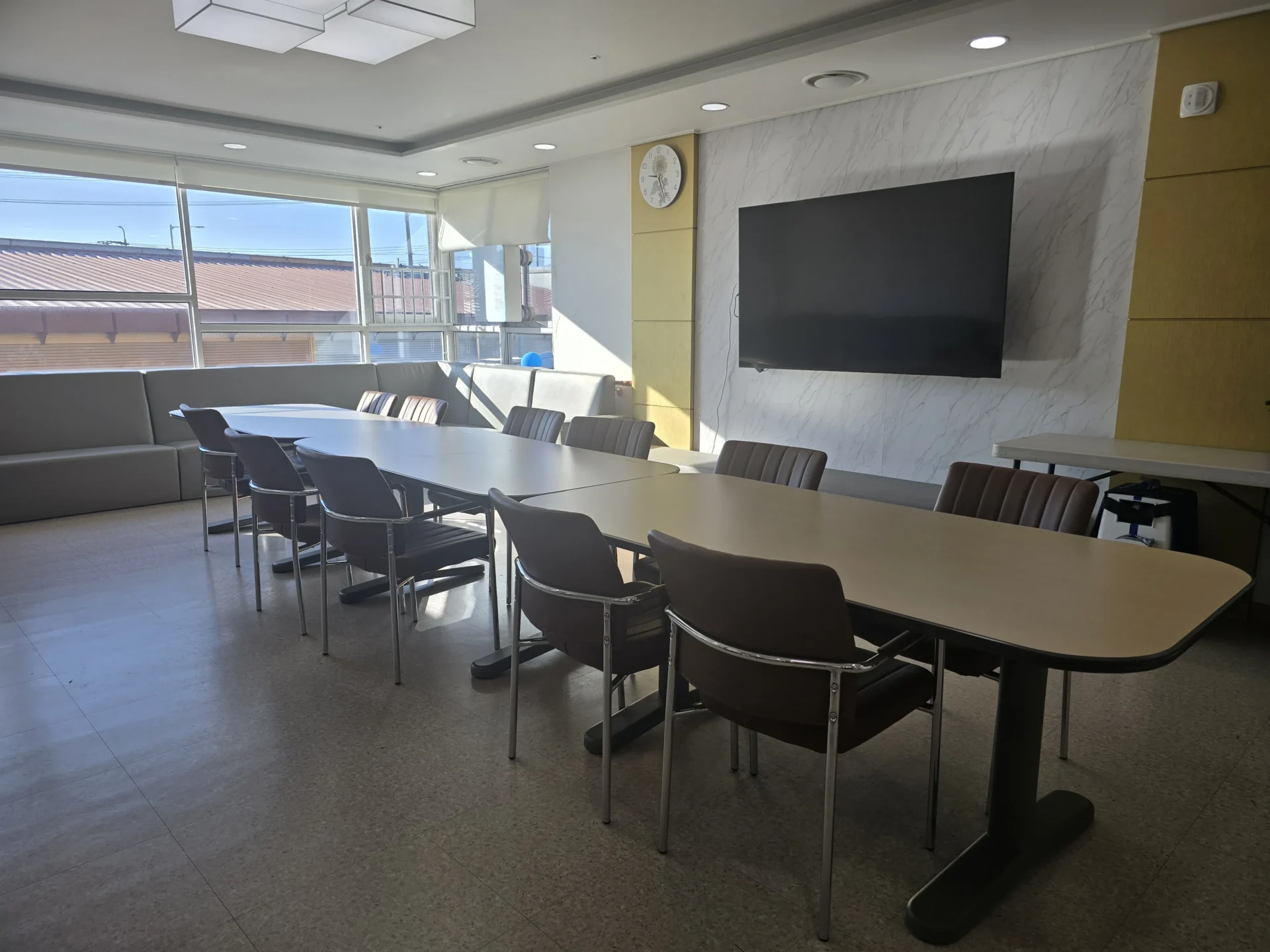 저희 요양원은 보호자 님과 어르신의 행복한 만남 시간을 위하여 탁 트인 공간을 면회 장소로 지정했습니다. 따사로운 햇살을 받으며 어르신과 즐겁게 담소를 나누시다 가실 수 있는 곳입니다. 면회하시는 도중에 혹시라도 음식을 나눠드실 수 있도록 전자레인지, 정수기, 기타 일회용품이 배치되어있습니다.